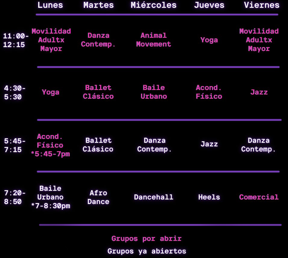 Reserva su espacio ya para no perder ninguna clase! Inscríbete hoy a la neswletter y vive tu pasión por la danza. ¡Te esperamos con los brazos (y pies) abiertos!